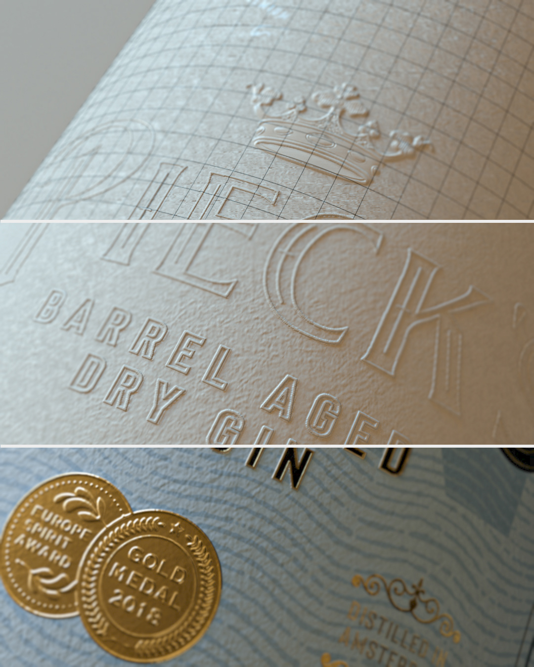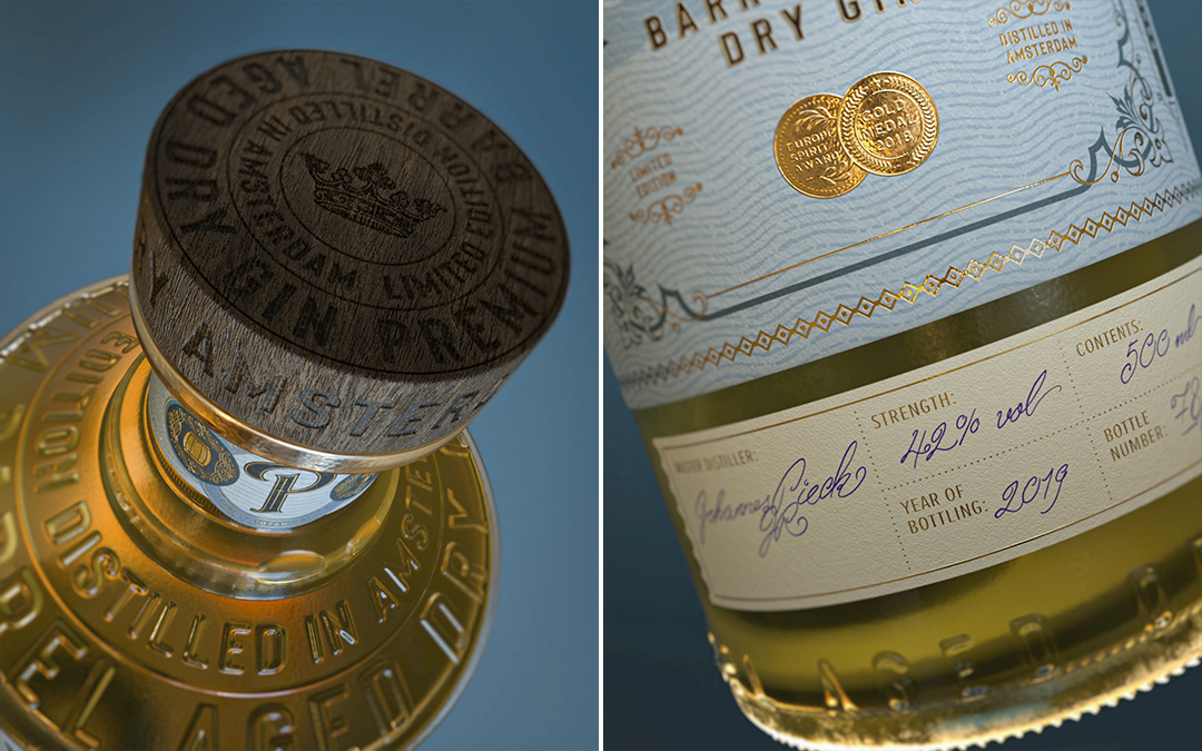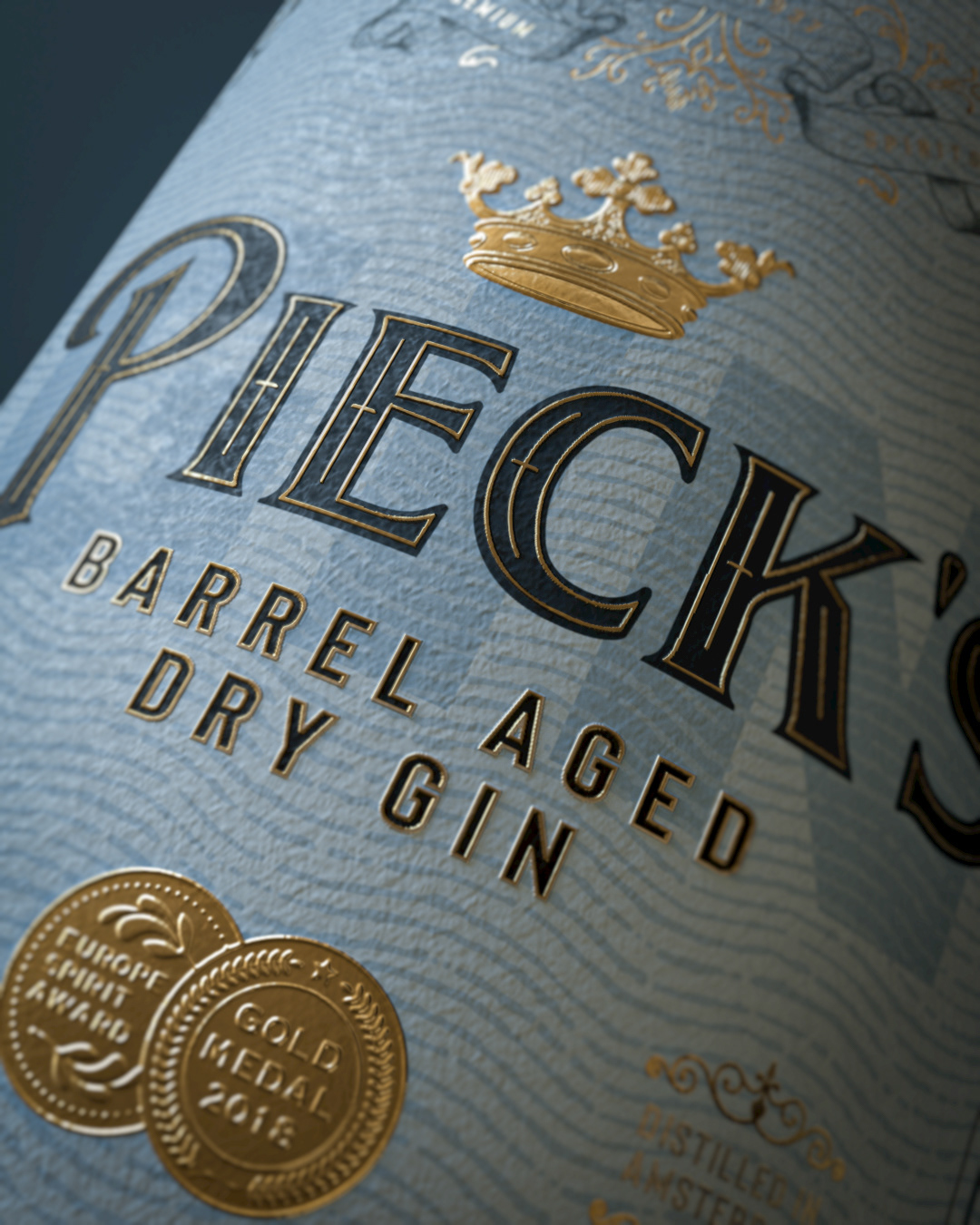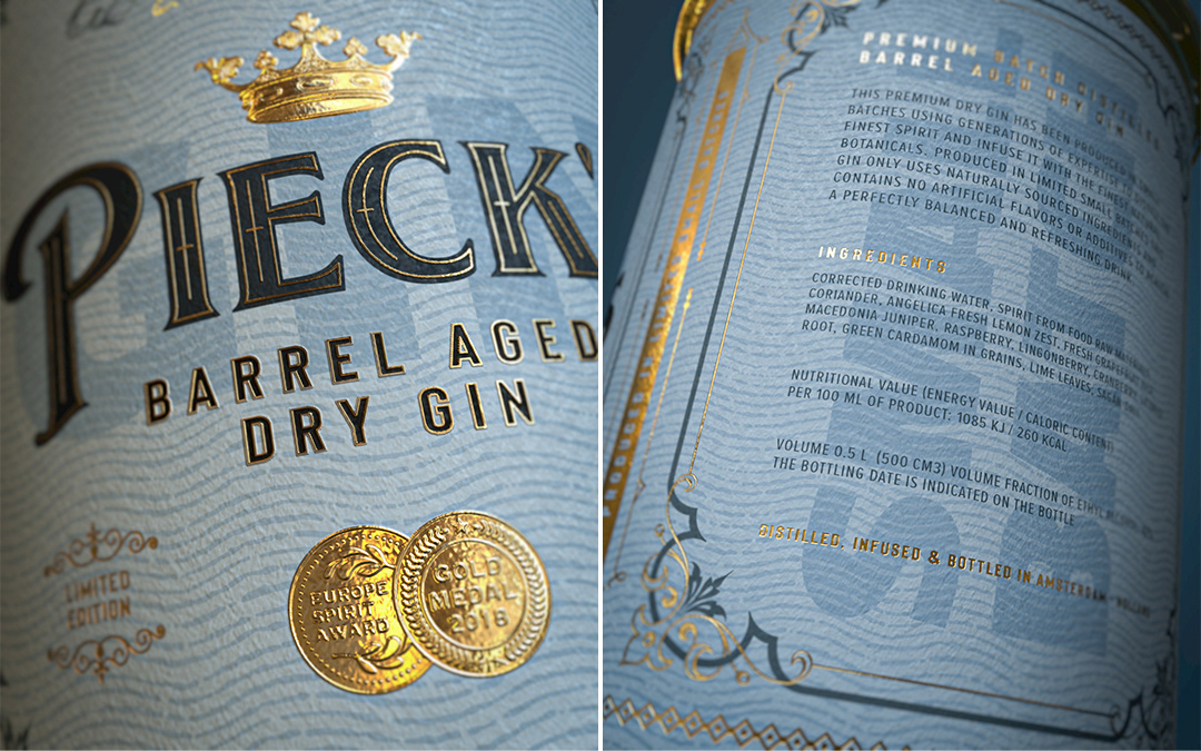 Graphic design / packaging design and 3d-visualization for Pieck's Amsterdam Premium Barrel Aged Dry Gin. Custom designed glass bottle. Label printed using a combination of luxurious embossed and debossed copper foil on rough heavy papers.