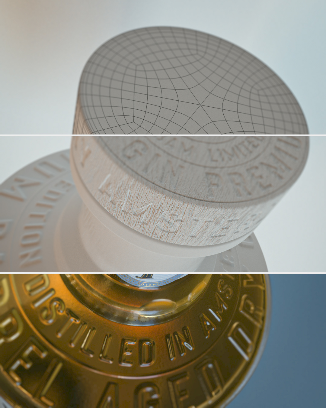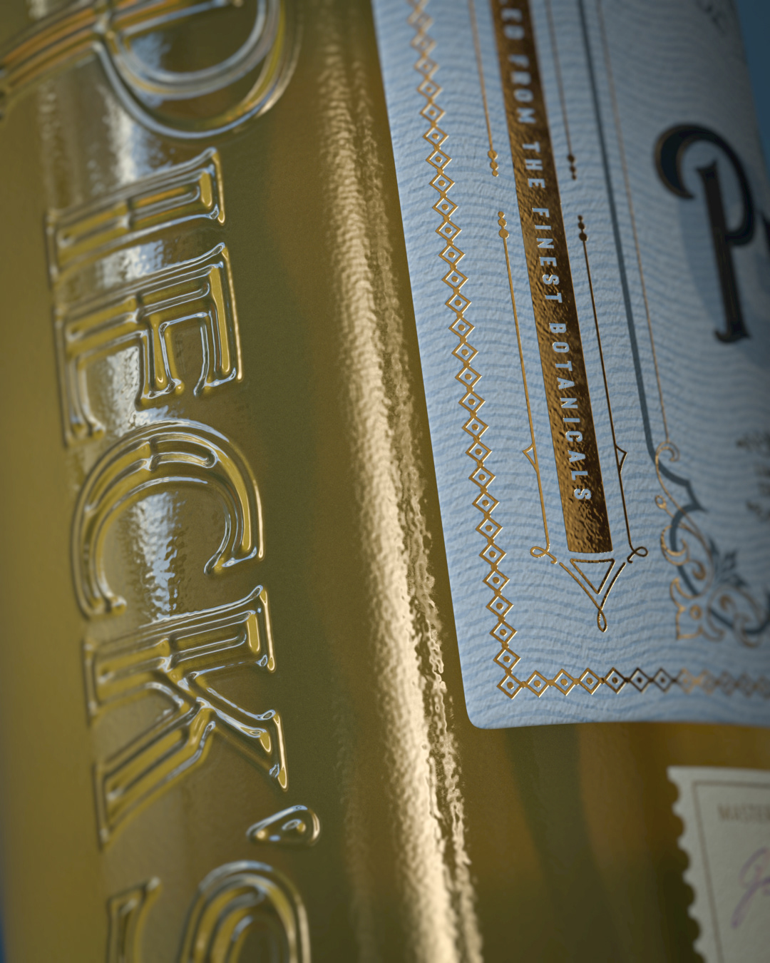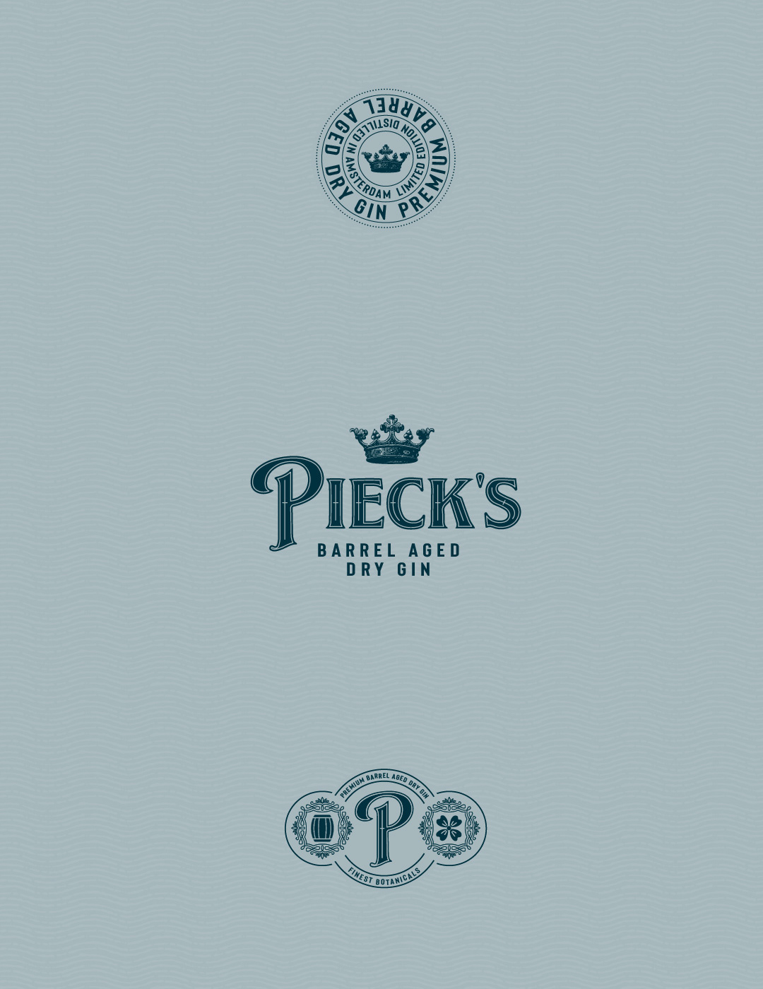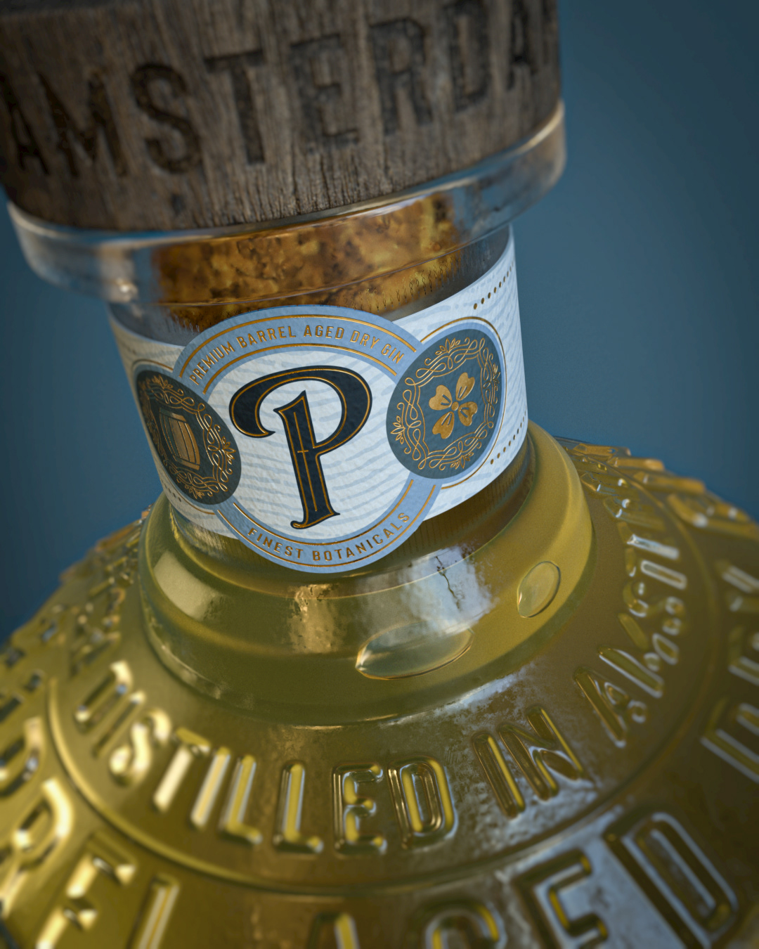Graphic design / packaging design and 3d-visualization for Pieck's Amsterdam Premium Barrel Aged Dry Gin. Custom designed glass bottle. Label printed using a combination of luxurious embossed and debossed copper foil on rough heavy papers.